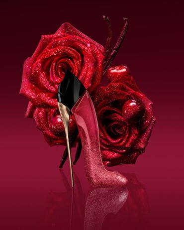 O Very Good Girl Glam Parfum eleva o icônico frasco Good Girl com salto agulha vermelho-cereja brilhante com uma cascata de glitter deslumbrante, uma expressão espetacular de feminilidade.